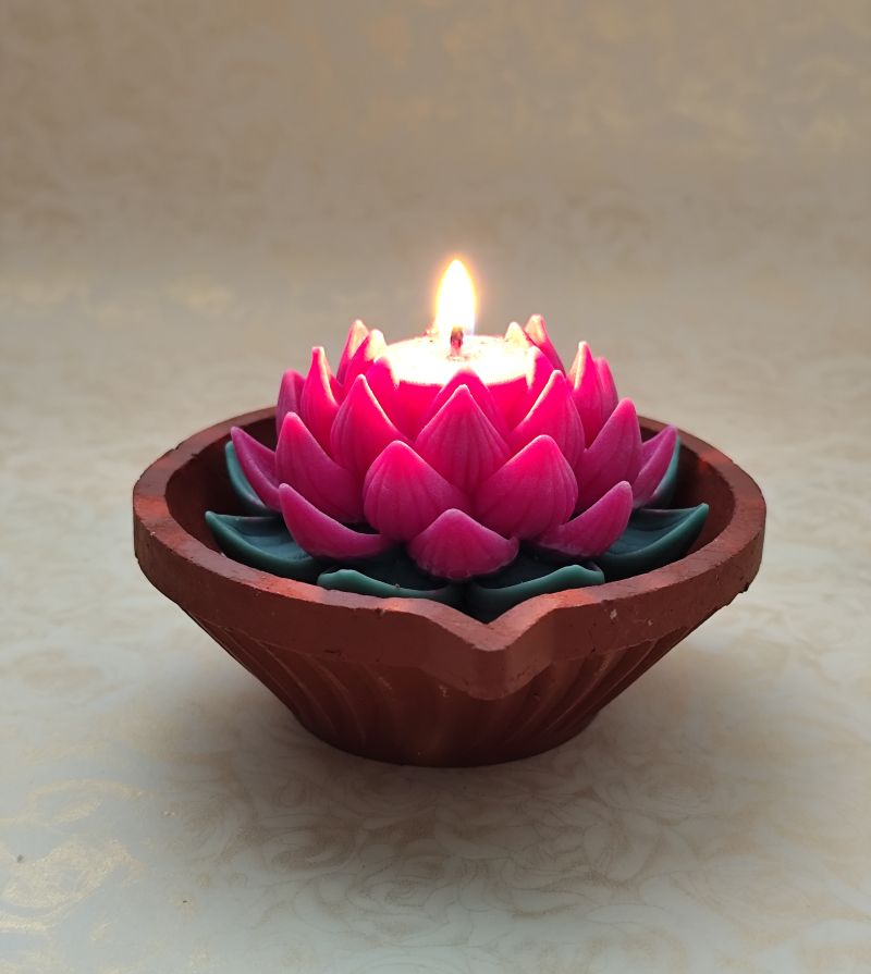Illuminate your celebrations with our Traditional Clay Diya Candles featuring a handcrafted pink lotus with green leaves — a symbol of purity, prosperity, and new beginnings